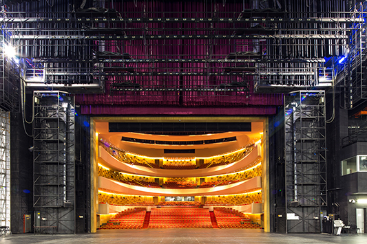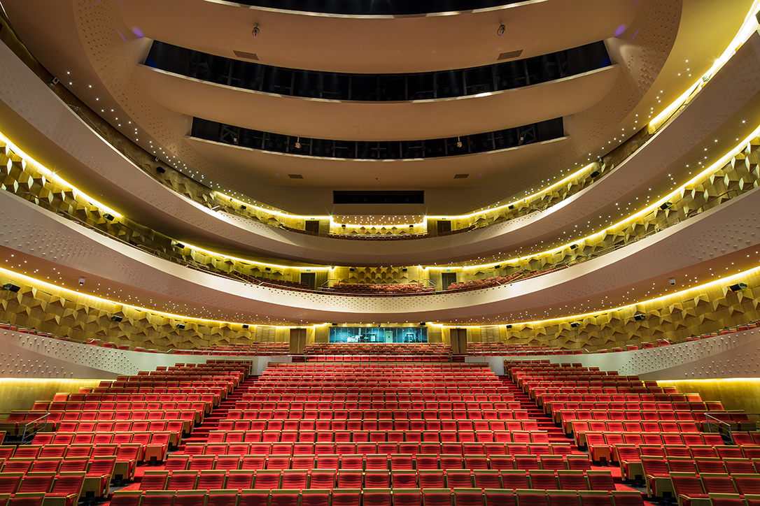 大劇場金色大廳內“鞋盒式”布局的觀眾席可容納1501人。劇場內部的設計、用材,充分考慮建筑聲學,混響時間達到國際標準的1.6秒。主舞臺采用國際上通行的“品”字形舞臺,舞臺機械、燈光、音響系統等設備均按照國內一流標準配置。能夠承接國內高水平的大型歌劇、舞劇、大型綜藝晚會的演出并兼顧交響樂、室內樂、合唱等演出和會議的需要,具備承接國際演出團體演出的基本功能和條件。